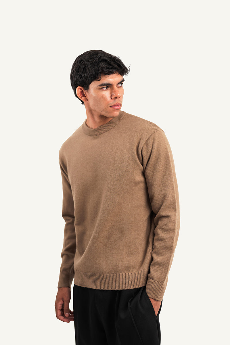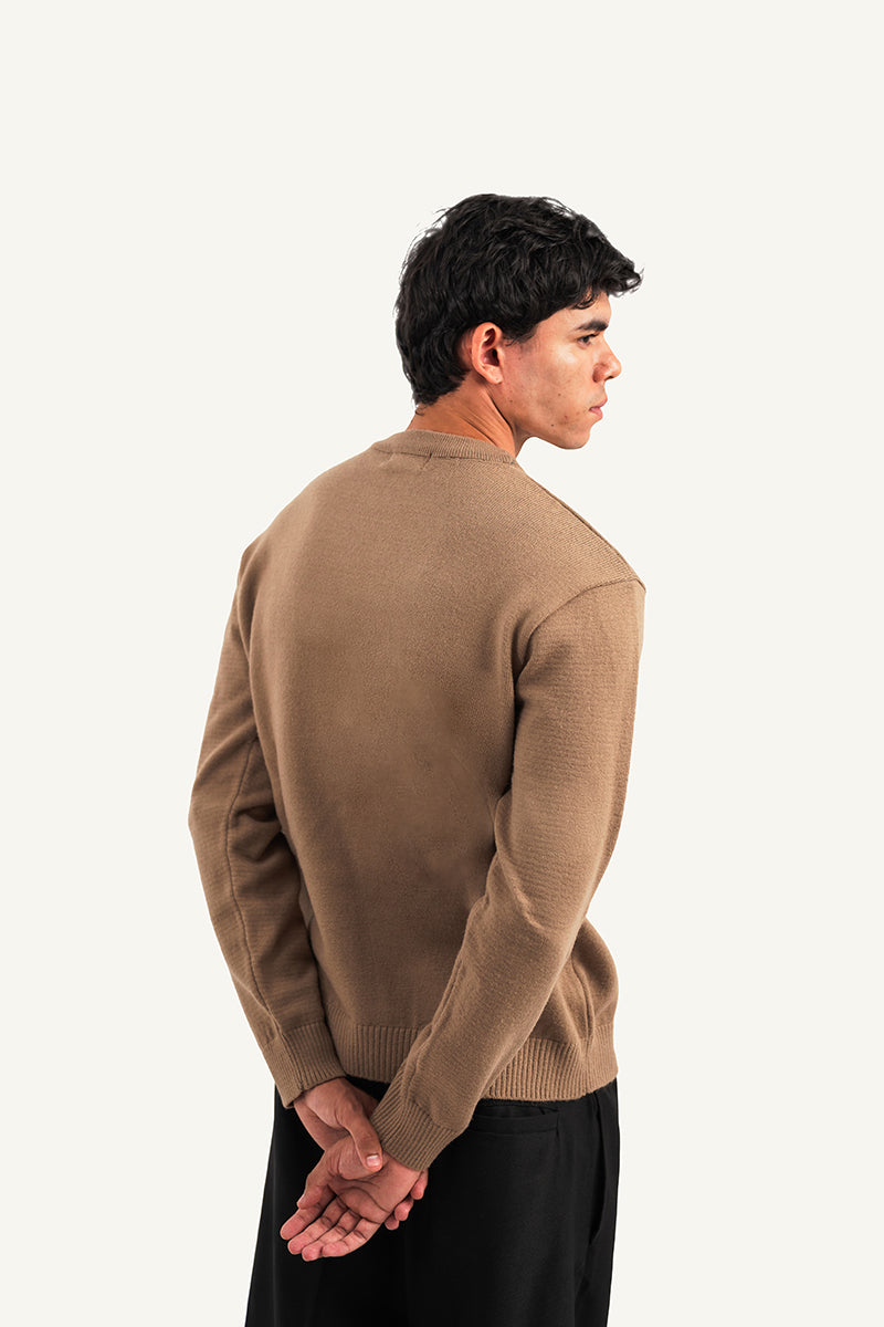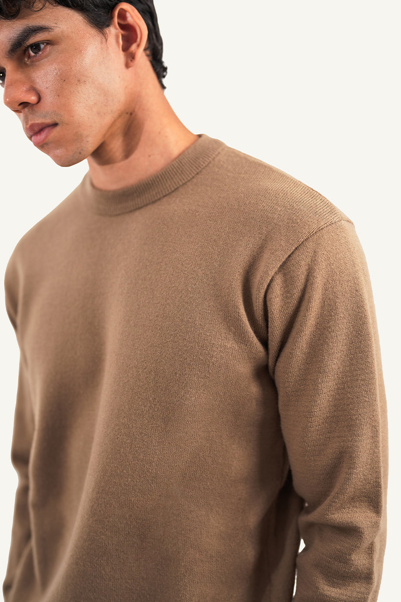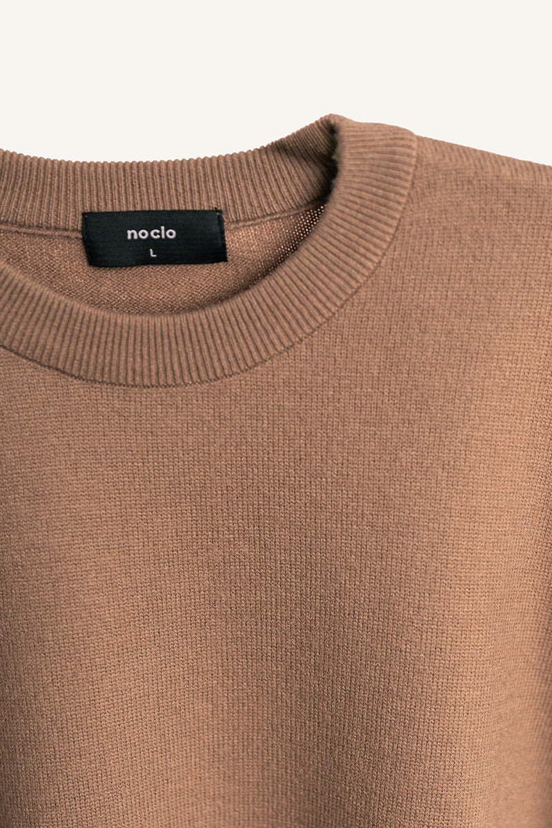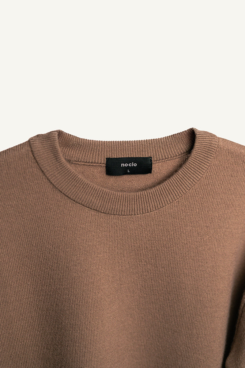 Brown knit sweatshirt crafted from cotton yarn. Crew neckline with ribbed trim. Long sleeves with ribbed cuffs. Straight hem with ribbed edge. Ideal for layering across seasons.