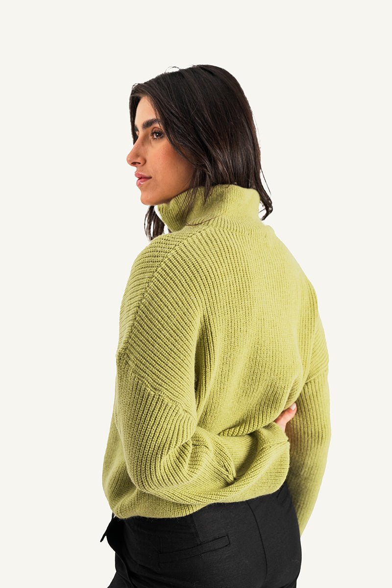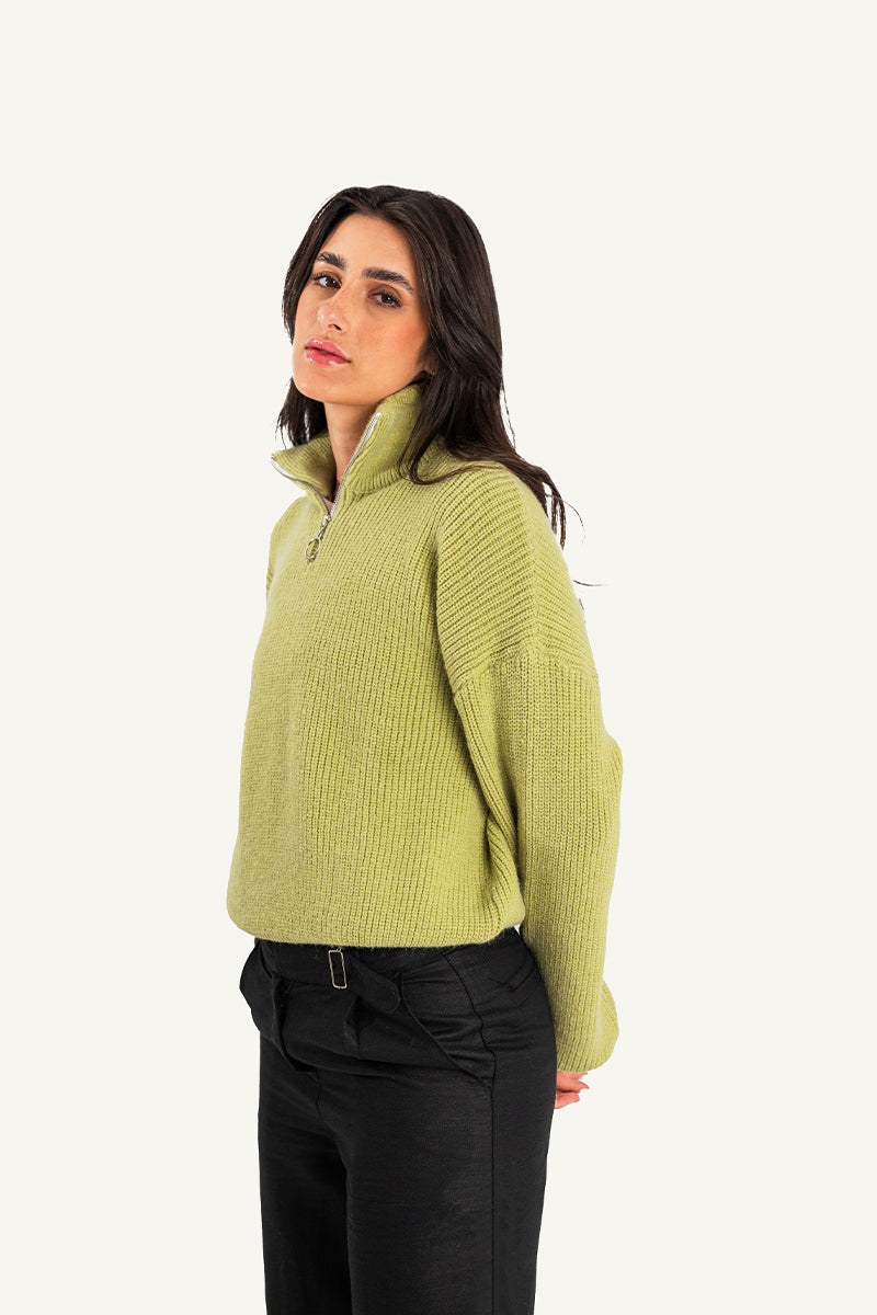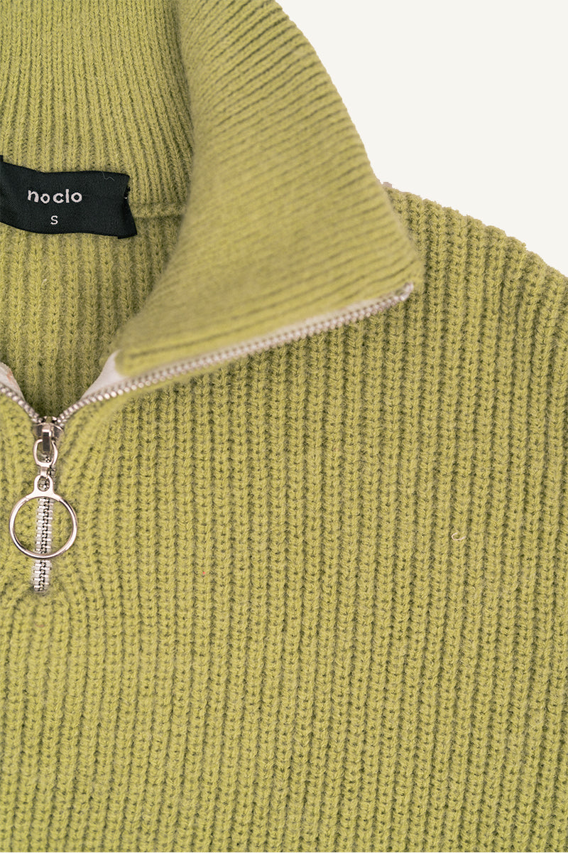 Sage green quarter zip in a soft-touch cotton. Featuring a high neck with quarter-length zipper fastening. Long sleeves with ribbed cuffs. Dropped shoulders for a relaxed fit. Subtle ribbed hemline.